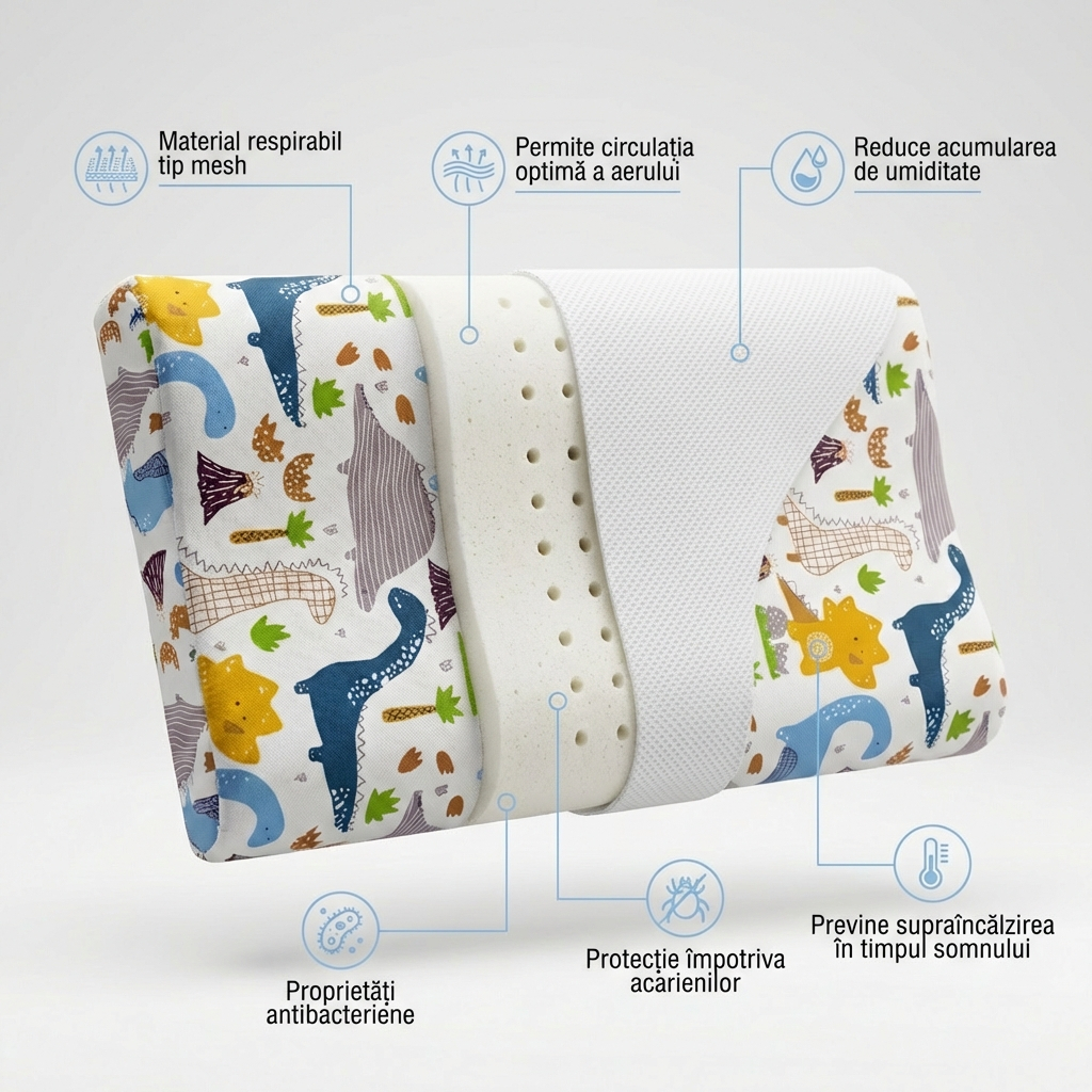 Interiorul din memory foam perforat se adaptează delicat formei capului bebelușului, oferind: